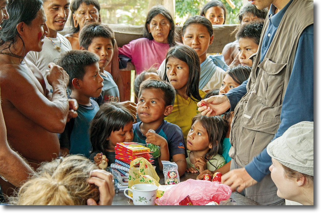 Подарки уже закончились, а индейцы всё не уходили, им хотелось чего-нибудь ещё. Подгоняемые голодом, мы сели перекусить, не дождавшись их ухода. Нас обступили со всех сторон и быстро разобрали со стола и без того немногочисленные продукты. Предстояло привыкнуть к тому, что они в силу своей наивности не соблюдают абсолютно никаких норм приличия и могут не только забрать у тебя продукты, но и залезть в твой рюкзак и взять понравившуюся вещь. Проводник вёл себя с ними довольно робко. Тогда мы ещё не понимали, почему он безмолвствует, когда забирают еду с нашего стола.