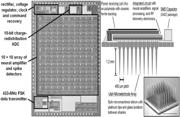 Подобные работы в этом направлении проводят другие исследователи (Reid R. еt al., 2007). Результаты своей работы они опубликовали в статье A Low-Power Integrated Circuit for a Wireless 100-Electrode Neural Recording System в журнале Ieee Journal of Solid-state Circuits (Jan. 2007. Vol. 42, 1), в которой они также представили свой микроэлектродный инструментарий и нейральный микрочип для создания нейроинтерфейса (рис. 6).