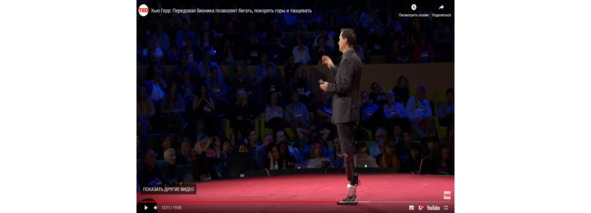 Рис. 16. Биоуправляемые протезы ног. Одними из наиболее совершенных протезов голени на сегодня считаются BiOM Ankle компании BionX (США), основанной проф. Массачусетского технологического института (MIT) Хью Хэрром (Hugh Herr), который в нем выступает на конференции ТОD (на снимке). Миоэлектрические протезы BiOM Ankle оснащены микропроцессорами и сенсорами, благодаря которым становится возможной мгновенная автоматическая регулировка угла наклона стопы и уровня