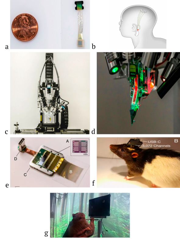 c робот-нейрохирург компании Neuralink, d устройство подачи игл для установки нитей; e прототип чипа с USB-C; f нейроинтерфейс компании Neuralink у экспериментальных животных (крысы); g макака по имени Пейджер с помощью имплантируемого интерфейса