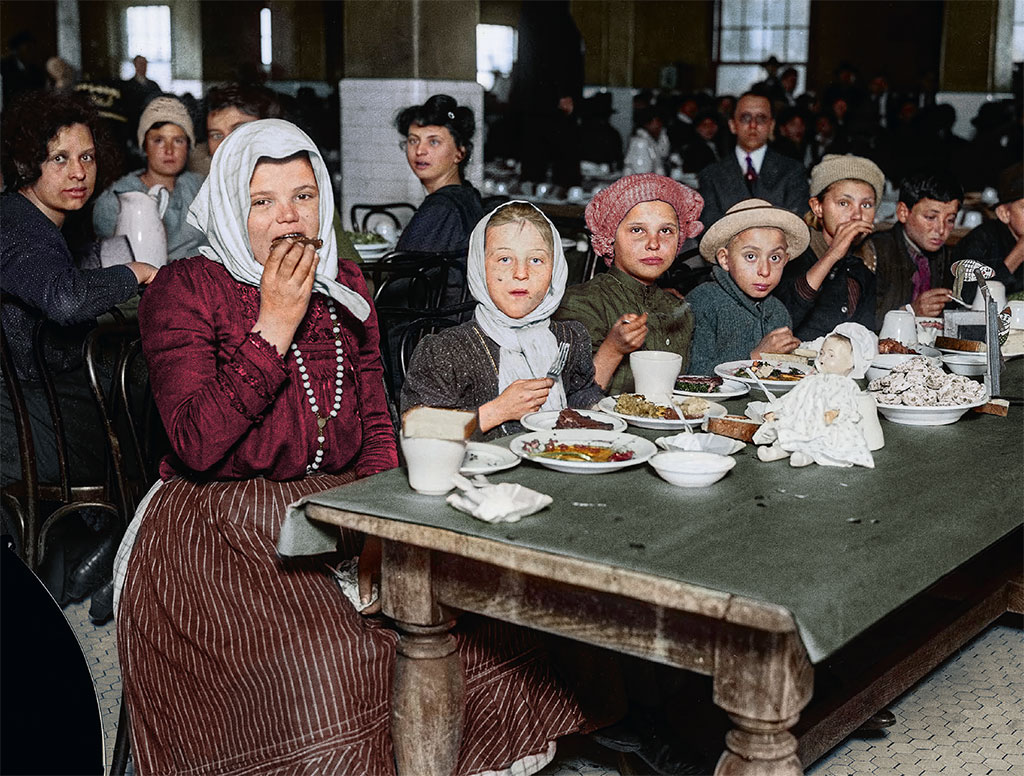 Волна новых американцев, хлынувшая к Тихому океану, состояла в основном из бедных европейских иммигрантов, соблазнившихся обещаниями получения земли, полнейшей свободой и возможностью сделать (или переделать) себя самим. В ходе переписи 1910 г. почти 12 миллионов американцев указали, что родились в Европе; на этом снимке мы видим небольшую, удивленно смотрящую в объектив группу вновь прибывших за первым рождественским ужином в своем новом доме.