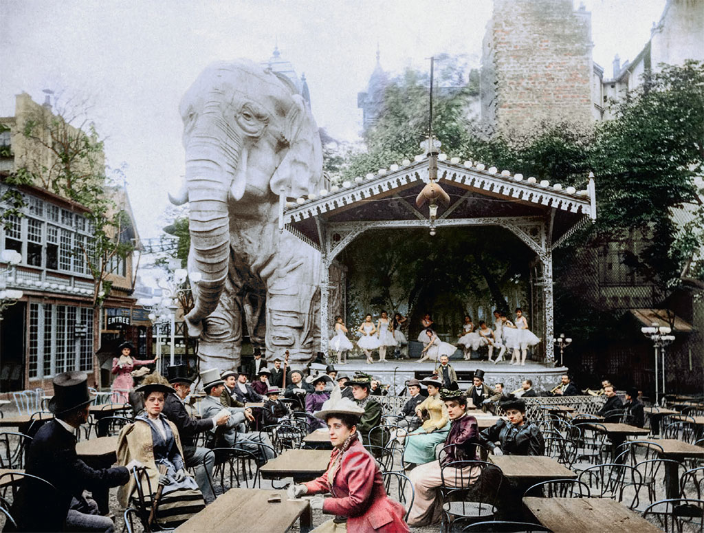 Еще в бытность принцем Уэльским Эдуард VII сделал открытие, что самое веселое место в Европе это Париж, где можно найти любое пикантное развлечение «прекрасной эпохи», почти полувекового периода относительной стабильности до 1914 г., когда искусство, прогрессивная мысль и благосостояние в крупнейших городах Европы переживали подъем. Ни одно место в Париже не отвечало принципу радости жизни (joie de vivre) лучше, чем монмартрский кабачок «Мулен Руж» с главным козырем лихим канканом, позволявшим заглянуть под юбки его исполнительниц. На этом снимке виден сад позади здания «Мулен Руж», танцовщицы в пачках, пестрая публика и огромный полый слон внутри его находился зал для отдыха, где, как поговаривали, можно было спокойно, без свидетелей побаловаться опиумом.