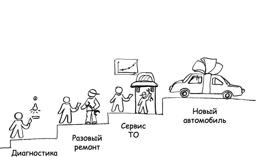 Компания-автодилер выстроила со мной лестницу ценностей: вначале мне дали что-то попробовать недорого, подсадили на системно необходимую услугу, привили мысль, что их машины лучшие, и в итоге продали мне автомобиль. Сразу купить новую машину, наибольший по цене и ценности продукт, взамен «барахлящей» старой я, как многие потенциальные клиенты, был не готов. Меня провели по воронке.