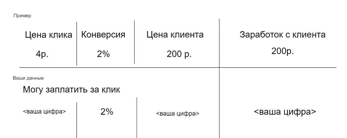 Подсказка: предполагаемый заработок с клиента умножьте на конверсию. Если еще не тестировали, возьмите средний показатель 2%. Это упражнение нужно для того, чтобы вы понимали, как важно учитывать конверсию, и знали, за какую цену можно смело купить трафик.