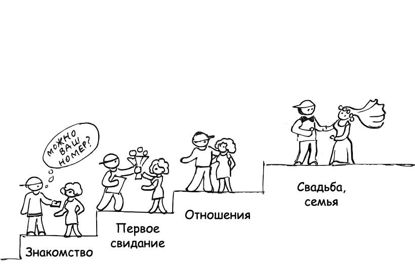 Представьте, что вы встретили девушку своей мечты и с первого взгляда решили, что хотите видеть ее своей женой. Вы для нее тоже идеальный кандидат. Но если вы подойдете к ней и через несколько минут знакомства предложите руку и сердце, вряд ли вы достигнете своей цели. Нарисуйте в своем воображении лестницу, где вы с этой девушкой в день знакомства находитесь на самой нижней ступени. На верхней ступени ваш счастливый брак. Нельзя с разбега запрыгнуть с первой ступени на последнюю. Нужно постепенно, шаг за шагом, пройти все ступени: развивать ваши отношения, увеличивая их ценность.