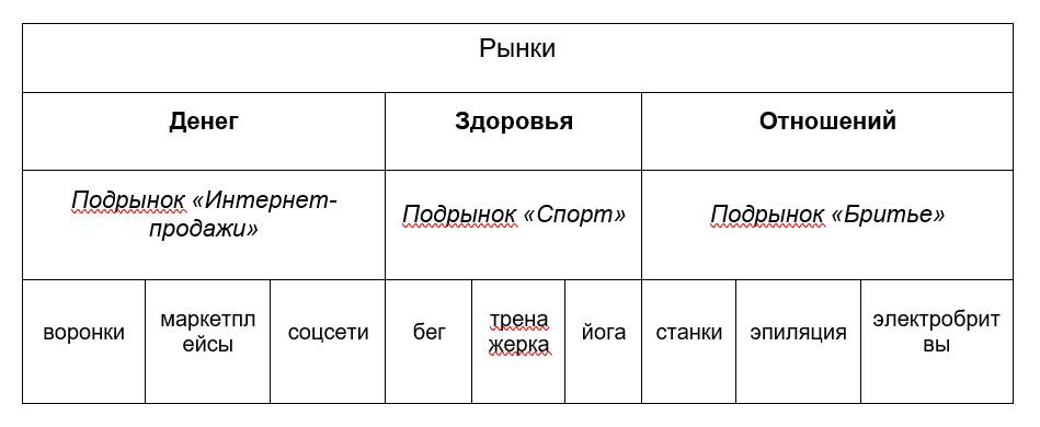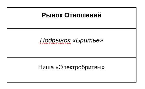 Простой пример. Человек хочет побриться. Зачем? Хочет выглядеть приятно для семьи, коллег, для общества. Ради хороших отношений. То есть на рынке отношений существует подрынок бритья. А на каждом подрынке есть ниша конкретный способ удовлетворения потребности. Кто-то будет использовать электрическую бритву, кто-то бритву с лезвием, а кто-то сделает эпиляцию.