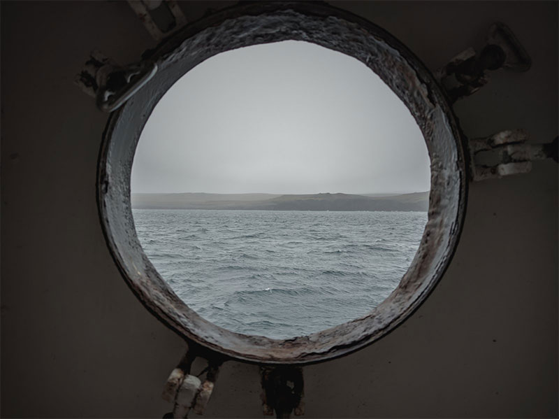 «Михаил Сомов» неспешно идет по волнам и вдруг сквозь хмарь и низкие тучи проступает берег. Мы приникли к иллюминаторам. Суровая, пустынная земля. Берег неровный, очертания изрезанные. Встаем на якорь, и мы узнаем новые вводные. Пока груз не будет доставлен на берег, волонтеры остаются на борту.