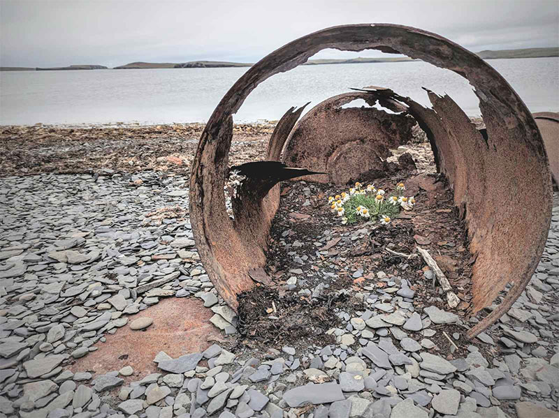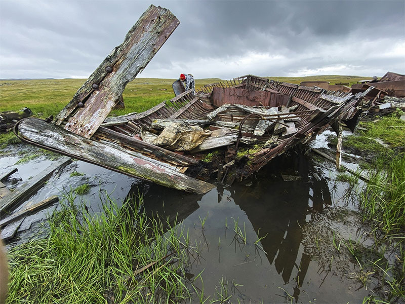 Спустились в ложбину «поля Армагеддона», как я про себя называю локацию, выбранную для первого приложения сил. Вдоль ложбины тянется дорога, к ее обочине мы и стаскиваем металлолом. Почва заболоченная; посреди поля-болота торчит остов лодки. Обшивка бортов давно сгнила, и лишь ребра-шпангоуты вырастают из топи. Делаем предположение, что некогда здесь располагался искусственный мелководный канал к морю.