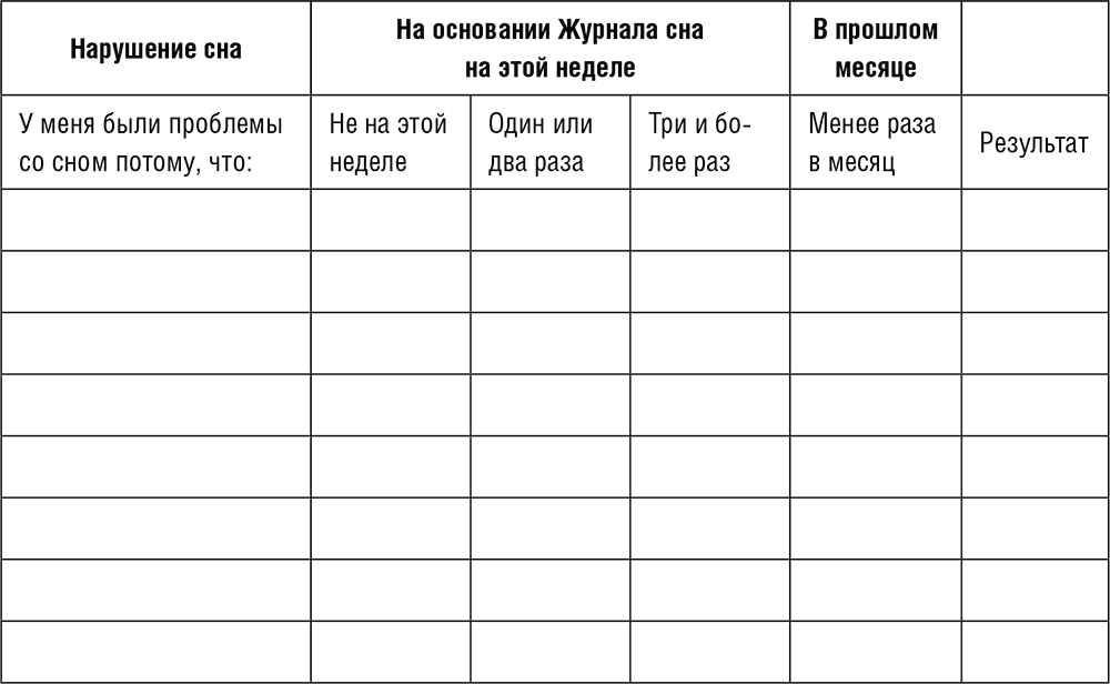 Выпишите все факторы из вопроса 10 в вашем Журнале сна под столбцом «Я не могу уснуть потому, что» (каждую причину пишите в отдельной строке). Затем укажите частоту, с которой эти факторы нарушают ваш сон. Если на этой неделе сбоев не было, отметьте пункт «Не на этой неделе» галочкой. Если же вам кажется, что вы испытывали нарушения сна в прошлом месяце, отметьте пункт «Менее раза в месяц» и оцените результат следующим образом: