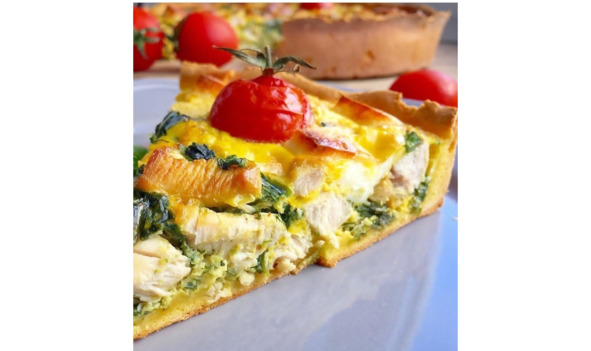 4. Взбить яйца с молоком, залить начинку. Можно украсить помидорами черри.