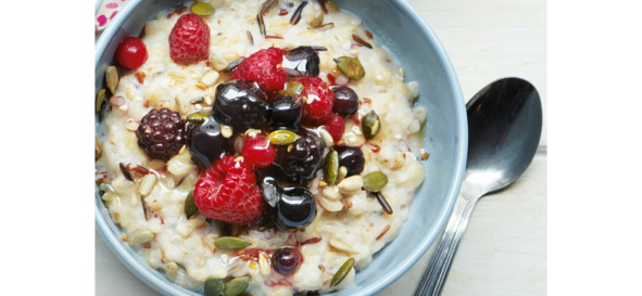 3. Соединить геркулес, белки, сахарозаменитель, украсить все это ягодами и маслом.