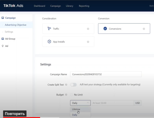 Здесь есть дневной или lifetime бюджет, и минимальный бюджет 50 долларов. Это значит, что на все объявления во всех группах, которые будут внутри этой рекламной кампании, в данном случае lifetime бюджет будет 50, либо дневной бюджет будет 50 долларов. Кликаем Continue.