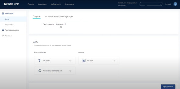 Нам нужно выбрать Цель. Цель это трафик и конверсии.