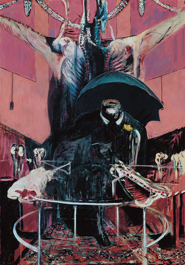 Бэкон воспринимал мясо как чудесное зрелище, но в то же время оно напоминало «о безысходном ужасе жизни, о том, что одно живет за счет другого», необычное понимание, но вряд ли его можно назвать новым в искусстве. Долголетняя традиция натюрморта в живописи, восходящая к шестнадцатому веку, основана на привлекательности битой птицы и говяжьих туш. Вдобавок существует еще одна традиция, включающая Гойю и Рембрандта, намекающая на связь между забитыми животными и смертью людей, даже святых мучеников. Мертвая индейка Франсиско Гойи наводит на мысль о мертвом святом, а Туша быка Рембрандта связывает производство пищевых продуктов с самой священной темой христианства распятием.