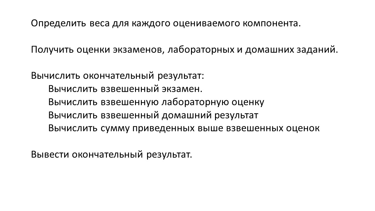 Подумайте о том, что будет считаться хорошим набором входных чисел для оценок экзаменов, лабораторных и домашних работ для тестирования программы.