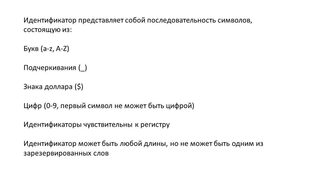 Идентификаторы чувствительны к регистру. Например, «Привет» с заглавной буквы отличается от «привет» со всеми строчными буквами.