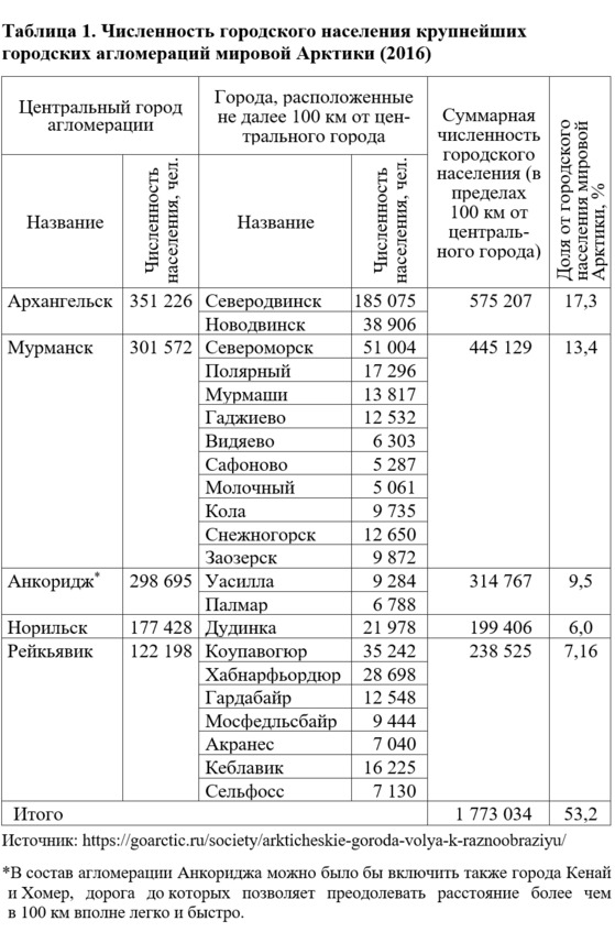 Вторая особенность городское население Арктики очень сконцентрировано. По сути, арктическая урбанизация это штучное количество локальных городских систем. Как уже отмечали исследователи, всего пять городских систем, сложившихся вокруг крупнейших городских центров Арктики, составляют более половины официального городского населения Арктики: это Архангельск, Мурманск, Анкоридж, Норильск и Рейкьявик с их пригородами. Только в Архангельске и Мурманске с окрестностями проживает почти треть горожан мировой Арктики и примерно половина Арктики российской15 (см. табл. 1).