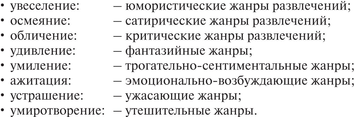 Существует целый спектр эмоционально-психологических состояний, моделируемых развлечениями, в соответствии с которыми можно классифицировать жанрово-стилевые формы развлечений в соответствии с их пафосом и представить проблемное поле развлечений, организующее массовую культуру в целом.