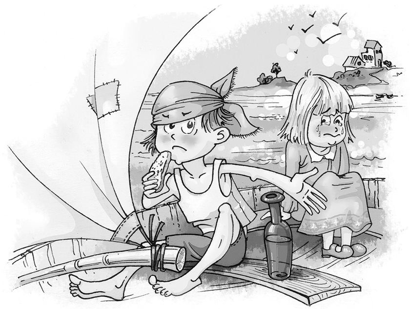 Чуть только рассвело, мы с Ниной тихонько вылезли из окошка, взяли с собой наш хлеб и бутылки в шлюпку. Я поставил паруса, и мы вышли в море. Я сидел как капитан, а Нина меня слушалась как матрос.