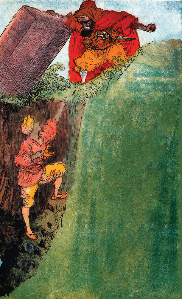 Магрибинец взял Аладдина за руку и повел к горе. Солнце уже закатилось, и было почти темно. Они шли очень долго и наконец пришли к подножию горы. Аладдину было страшно, он чуть не плакал.