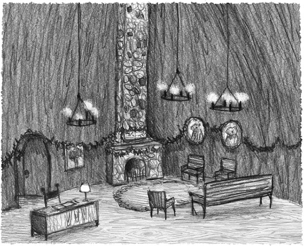 Внутри ствола оказался просторный зал (а для мышки даже очень просторный!): здесь могла уместиться компания небольших зверушек. Напротив двери располагался каменный очаг, он не горел, но был украшен гирляндой из разноцветных листьев. Перед ним был расстелен коврик из мха, а вокруг стояли диваны и кресла из прутиков, обитых всё тем же мхом. Слева располагалась длинная деревянная стойка, на ней лежала большая книга и карандаш из веточки. А с потолка свисали подсвечники-кольца со свечами, которые давали мягкий золотистый свет.