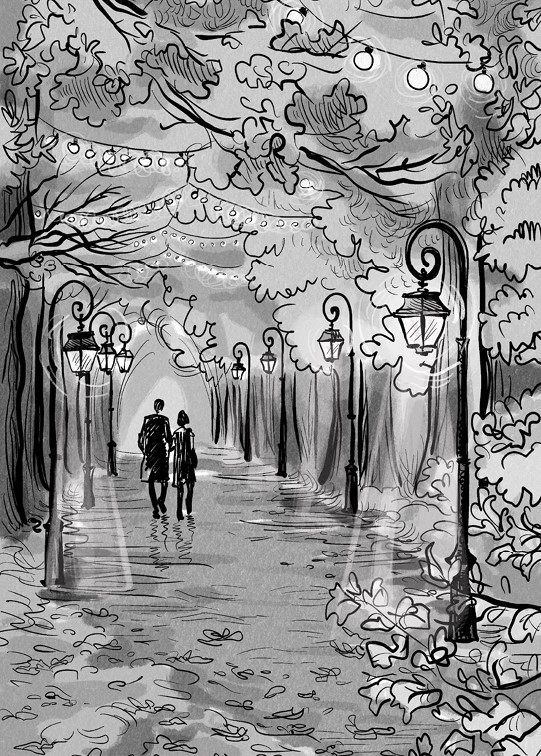 Высокие деревья были подсвечены гирляндами фонариков, запутавшихся в ветвях, опавшие листья украшали дорожку, а если долго смотреть вверх, можно было заметить, как эти самые листья медленно летят вниз, к земле.