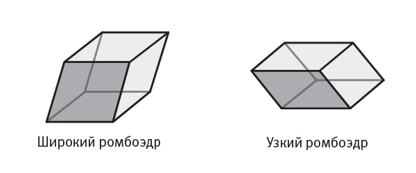 На первой Маккей изобразил пару ромбоэдров широкий и узкий, как показано на рисунке внизу. Нам с Довом эти трехмерные фигуры уже были хорошо знакомы. Это были очевидные трехмерные аналоги широких и узких ромбов, которые использовались для построения двумерных замощений Пенроуза. Так что, по-видимому, Маккей шел тем же путем, что и мы.