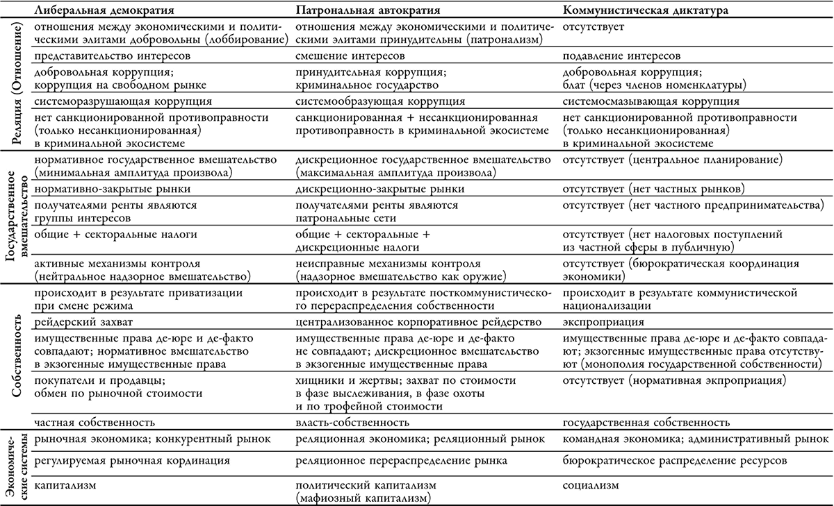 Таблица 5.1: Экономические феномены в трех полярных типах режимов (с названиями частей и глав)
