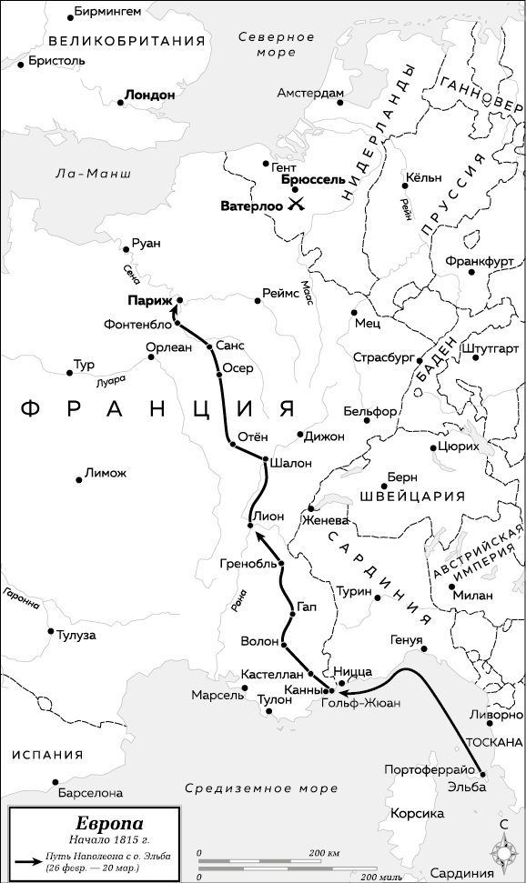 Про Наполеона можно было сказать что угодно, но только не то, что он признал поражение. Он следил за новостями из Франции и отмечал недовольство реставрацией монархии. Повсеместно росла безработица, хлеб дорожал, и народ, с облегчением и радостью принявший отречение императора, теперь вспоминал его правление с сожалением. А раз так, Наполеон начал строить планы. Ему был оставлен крошечный флот ничего такого, что могло бы угрожать стерегущим его британским и французским кораблям, и в середине февраля 1815 года Наполеон приказал, чтобы бриг Inconstant, самый крупный из его кораблей, зашел в порт. «Отремонтируйте его медное дно, распорядился он. Устраните протечки и раскрасьте его под английский бриг. Я хочу, чтобы 24-го или 25-го числа этого месяца он был готов и вышел в залив». Он приказал снарядить и два других больших корабля. Наполеону дозволялось держать на острове Эльба 1000 солдат, включая 400 ветеранов старой Императорской гвардии, и батальон польских улан. С этими-то войсками он и попытается войти во Францию.