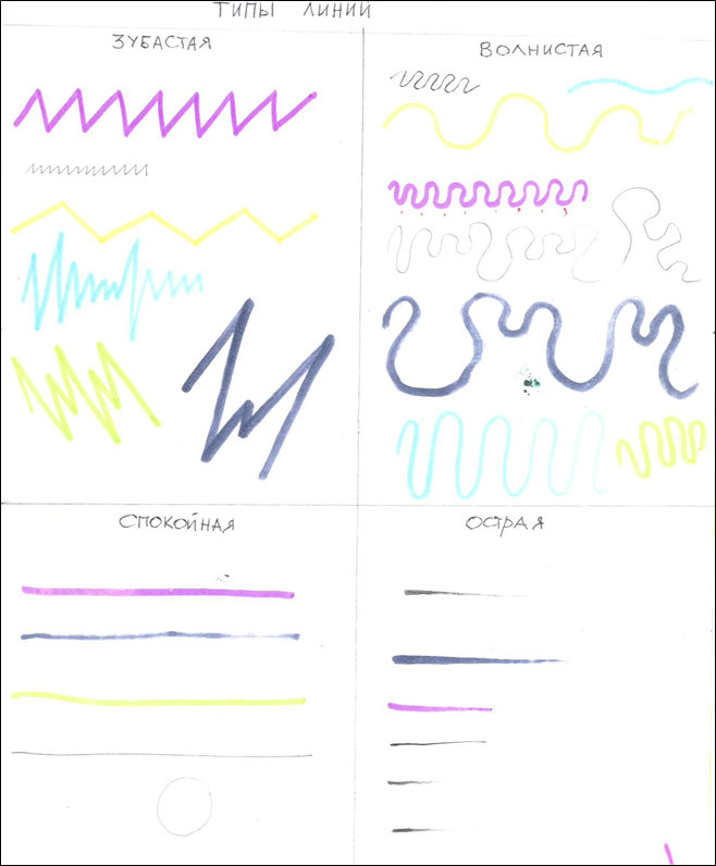1. Нарисовать собственную таблицу типов линий с аналога: линии могут быть произвольной, не повторяющей табличную формы. Обязательно выполнение тремя типами материалов разной степени жесткости: фломастером, карандашом НВ и шариковой ручкой. Необходимо проследить, чтобы у ломаных линий не было скруглений, у волнистых углов, а острые обладали плавностью перехода.