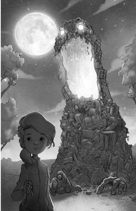 Из-за деревьев появляется чудовищный исполин и останавливается позади девушки. Он напоминает кучу мусора. Нет, не просто напоминает, так и есть! Его туловище бесформенная гора из всего, что люди кидают на свалку: сломанные телевизоры, рваные одеяла, гниющая еда, ненужная бытовая техника, старые матрасы, вонючие носки, протухшие йогурты Великан высокий, как башня, и толстый, как ствол гигантского дерева секвойя.
