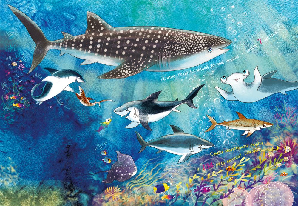 А длина китовой акулы почти 20 метров! Захоти она вдруг встать на хвост рядом с домом, носом дотянулась бы до седьмого этажа! Но грозная она лишь на вид, а так мирная и ест планктон мелких существ, которых в море множество. Вот какие мы разные, да и живём в разных морях и океанах.