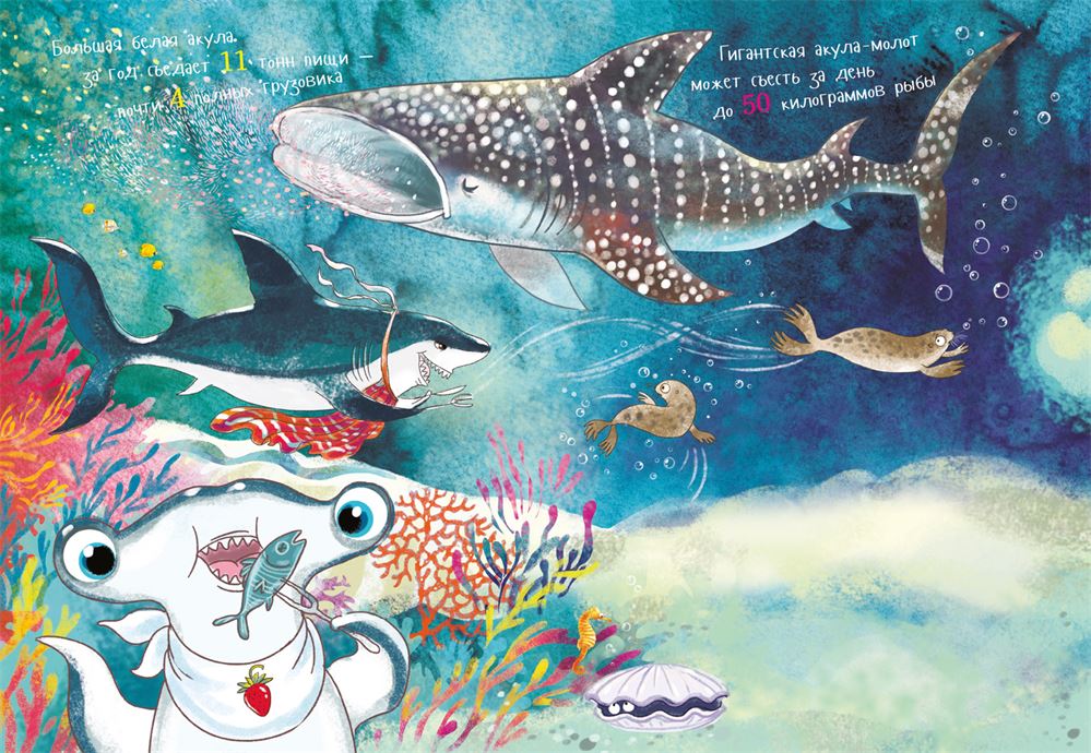 Это у вас завтрак, обед, ужин, а мы всегда начеку: увидел еду не зевай! Нам, молотам, угодить легко: кальмары, крабы, рыбы м-м-м, объедение! Стыдно, но случается иной раз закусить скатом и даже другой акулой, помельче. Вот белая акула ловит тюленей и даже мелких китов! А китовая помните? питается морской мелочью, планктоном.