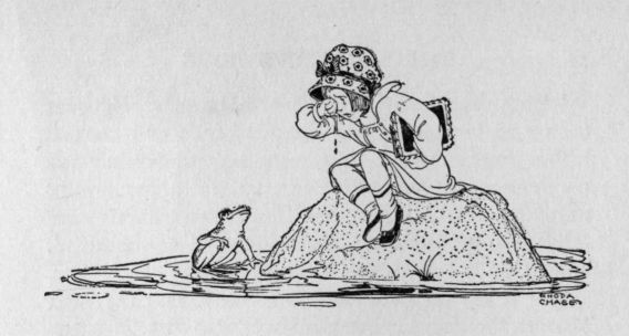 Она была на маленьком островке посреди пруда; лягушка выпрыгнула из пруда, скорчив ужасную гримасу, сев рядом с девочкой.