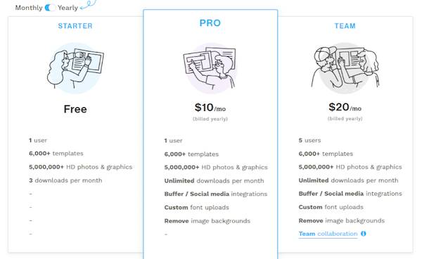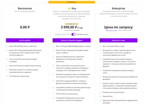 Есть бесплатный тариф, но его главный недостаток в том, что на бесплатном тарифе нельзя скачивать сделанные дизайны, поэтому его целесообразно использовать только на платных тарифах.