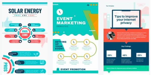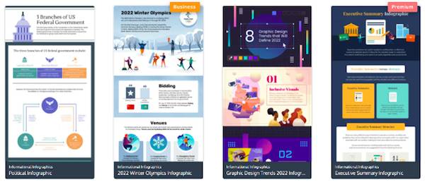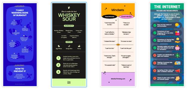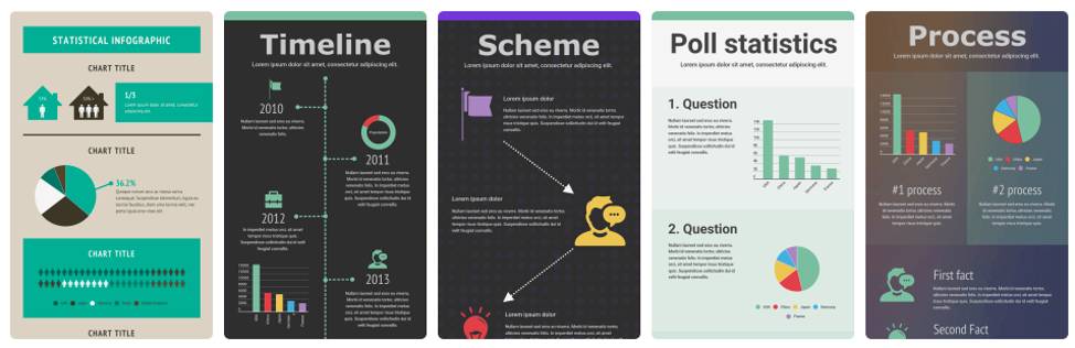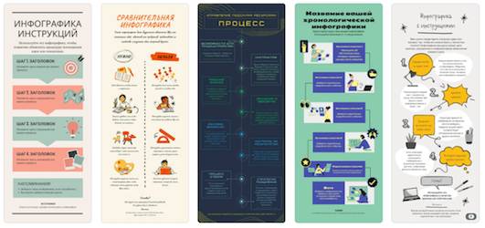 Для удобства они разбиты по темам и типам: образование, бизнес, благотворительность, инструкции, временная шкала. Бесплатно можно пользоваться тысячами изображений из банка сервиса.