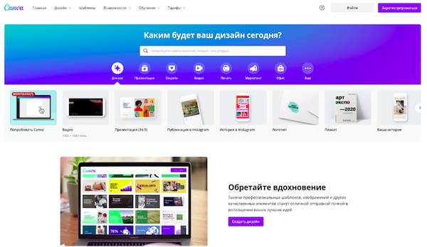 Англоязычный. На бесплатном тарифе есть ряд ограничений доступны не все шаблоны, можно сделать только 5 дизайнов, 6 загрузок изображений и так далее.