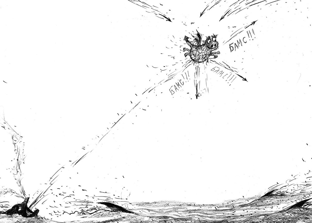 Пескакулы ничего подобного Мухрюнделю никогда раньше не видели. Чем гуще они осыпали его дротиками, тем больше стрелок отскакивало от кругленького тельца. Это сбивало с толку. Хищники выпустили по умильному домашнему дракончику столько дротиков, что накачанная ядом под завязку малявка должна была бы уже валяться замертво на песке, а не порхать взад-вперед и вести светскую беседу.