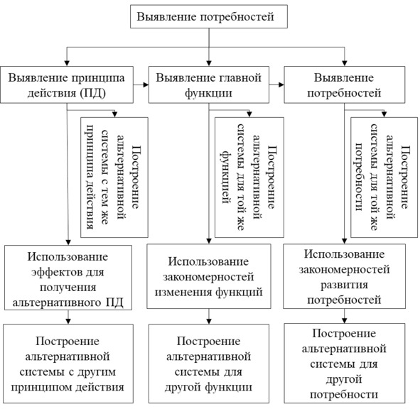 Альтернативные принципы действия можно найти, используя различные виды эффектов и трансфер технологий. Альтернативные функции можно выявить, применяя закономерности изменения функций. Альтернативные потребности можно выявить, используя закономерности развития потребностей.