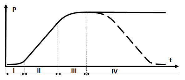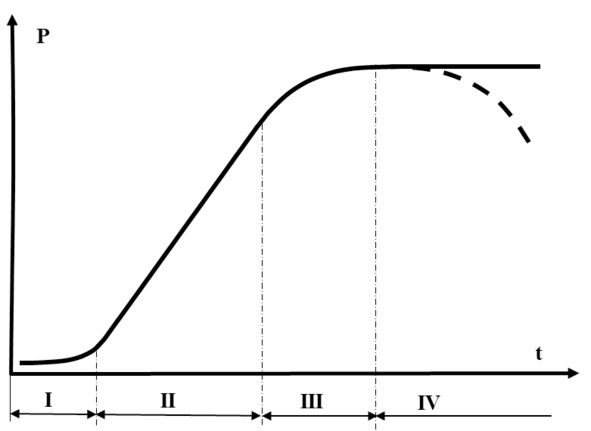 Вначале система развивается медленно (этап I), при достижении некоторого уровня развитие ускоряется (этап II) и после достижения некоторого более высокого уровня скорость роста уменьшается и в конечном итоге рост параметра системы прекращается (этап III). Это этап стагнации, который может продолжиться очень долго. Иногда параметры начинают уменьшаться (этап IV) система умирает (на графике это изображено пунктирной линией).