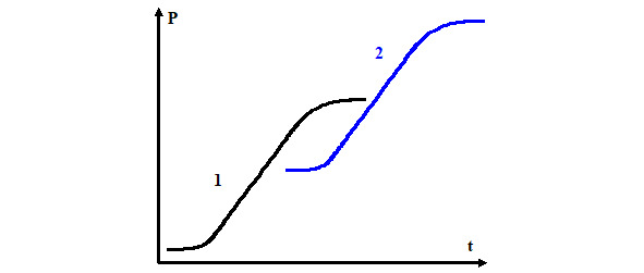 Прекращение роста данной системы не означает прекращение прогресса в этой области. Появляются новые более совершенные системы происходит скачок в развитии. Это типичный пример проявления закона перехода количественных изменений в качественные (п. 3.1.2). Такой процесс изображен на рис. 3.4.