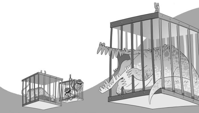 Но самое невероятное было не в этом. Самым невероятным было то, что под потолком на цепях висели клетки с очень толстыми прутьями. А внутри клеток сидели звери всех мастей! Там были обезьяны, экзотические птицы, белки, леопард а ещё там были крокодилы!
