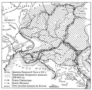 Овладев Киевом, Олег, а затем и Игорь под хазарским давлением вынуждены были унаследовать экспансионистскую дохристианскую политику Аскольда в отношении Константинополя (походы 907, 941, 944 гг.). Но одновременно получил развитие и процесс выхода Руси из сферы геополитического влияния Хазарии, начатый подчинением Киеву хазарских данников: северян, радимичей и вятичей в 883-885 гг.[19], продолженный в 939-940 гг. походом русов в Крым[20] и законченный разгромом в 963-968 гг. Хазарии дружинами Святослава Игоревича в союзе с печенегами и гузами[21].