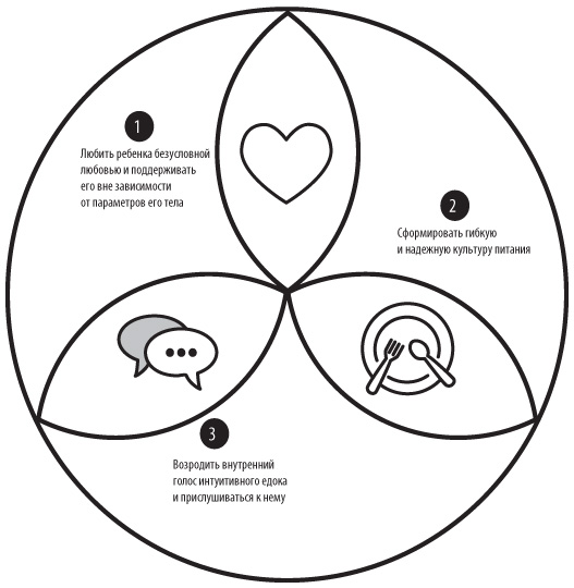 Это важно. Порой вы будете чувствовать, что обязаны «следовать правилам» в том, что касается времени принятия пищи и набора продуктов. Это вполне нормальные мысли, ведь структура важна. Но читайте дальше. Чтобы вырастить интуитивного едока, ориентируйтесь на три ключа, когда принимаете решения. Культура стройности строга и предусматривает множество правил, тогда как интуитивное питание это гибкая система. Жесткие рамки препятствуют гибкости. Чаще всего нам нужно пространство для маневра, даже если ситуация идет вразрез всему, что мы до этого знали. Ежедневно могут неожиданно появляться возможности перекусить. Ориентируясь на три ключа, вы сможете принять решение, что именно кажется вам правильным. Вы будете вооружены информацией о чувстве голода, которое может испытывать ребенок; о сознательном изменении поведения; психологических аспектах, лежащих в основе интуитивного питания; стремлении вырваться из-под неприятного контроля или избежать давления, связанного с едой; о постулатах нутрициологии. Мы не хотим устанавливать жесткие правила, нарушив которые вы будете чувствовать себя виноватыми. Мы хотим освободить вас долой правила! На вас и так уже оказывают огромное давление культура стройности, медики, школьная система питания, другие родители, вы сами, в конце концов. В основе интуитивного питания лежит идея о том, что вы должны освободиться, довериться себе, настроиться на себя и дать себе возможность выбирать. Так вы научитесь верить сигналам, которые подает ваше тело и тело вашего ребенка, учитывать их потребности и желания. Мы хотим, чтобы вы прониклись концепцией интуитивного питания и помогли сделать то же самое своим детям.