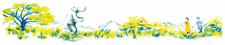 Гуляем, ходим на озеро вдвоём, или ещё с одним мальчиком и его слоном. Я учу его всему, что должен уметь слон.