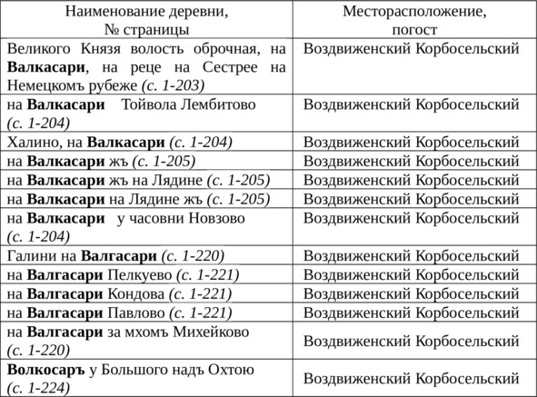 Таблица Б2Топонимы Валкасаръ/Валгасаръ по «Переписной книге Водской пятины 1500 года»