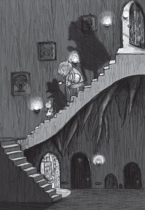 Сурок сонно побрёл за Моной по коридору и через вестибюль к лестнице, бормоча себе под нос: «Ах, тень, пойдём с нами. Мне спать и тебе спать».