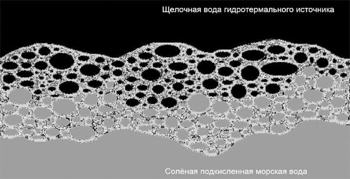 Рис. 2. Микропористые ячейки, проводящие щелочную воду гидротермального источника, частично заполнены также подкисленной соленой морской водой