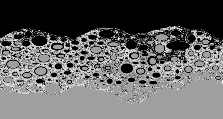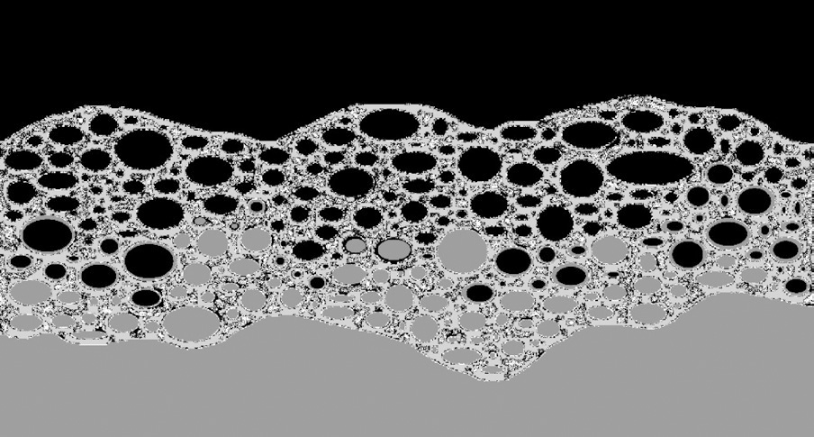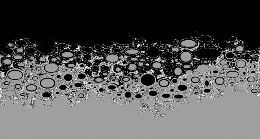 Рис. 4. Повторное заполнение во влажную фазу: граница раздела фаз проходит по новой линии, в результате чего часть ячеек с щелочными отложениями на стенках заполняется кислой средой и наоборот