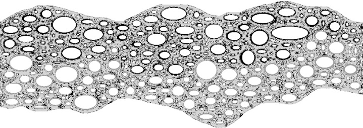 Рис. 3. Сухая фаза: минеральные и органические осадки из щелочной воды источников и соленой морской воды оставили отложения на стенках микроячеек (отмечены черным и серым цветом соответственно)